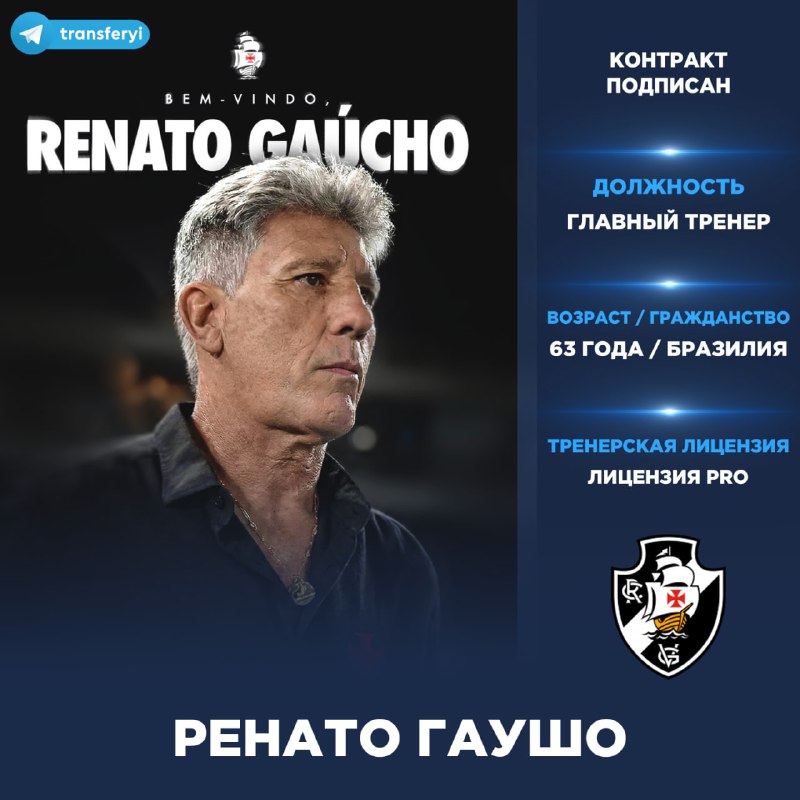 Официально: Ренато Гаушо — новый главный тренер «Васко да Гама» (Бразилия). Контракт до конца 2026 года.