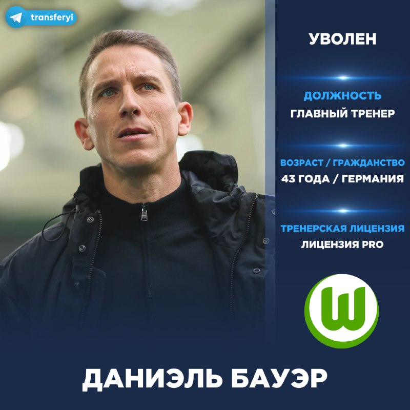 Официально: «Вольфсбург» уволил Даниэля Бауэра с поста главного тренера.