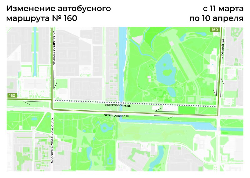 Автобусы №№ 160, 260 изменят трассу с 11 марта Из-за работ в боковом проезде Петергофского шоссе с 11 марта по 10 апреля изменятся трассы автобусов №№ 160, 260. Автобус № 160 будет следовать по осно