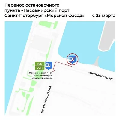 Остановка "Пассажирский порт Санкт-Петербург "Морской фасад" будет перенесена С 23 марта остановка “Пассажирский порт Санкт-Петербург “Морской фасад“ (при следовании к наб. Миклухо-Маклая), для автоб