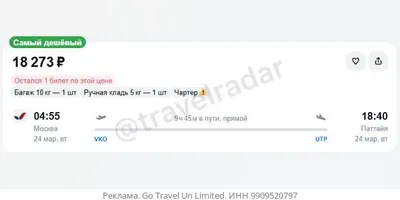 Москва — Паттайя от 18300₽ в одну сторону, вылет 24 марта, рейсы прямые, с багажом — 24.03 - 18300₽