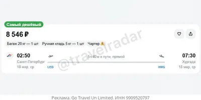 Санкт-Петербург — Хургада за 8500₽ в одну сторону, вылет ночью, рейсы прямые, с багажом — 18.03 - 8500₽