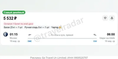 Москва — Шарм-эш-Шейх за 5500₽ в одну сторону, вылет ночью, рейсы прямые, с багажом — 18.03 - 5500₽