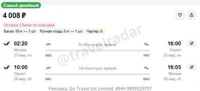 🔥 Москва — Пхукет (Таиланд) за 4000Р⚡️⚡️⚡️ туда и обратно, рейсы прямые с багажом — 23-28.03 — https://travelradar.ru/t/jYVQU — 2 билета — 8000Р — 3 билета — 12000Р — 4 билета — 16000Р — 5 билетов —