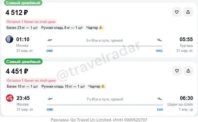 Москва — Хургада за 72004500₽ в одну сторону, вылет ночью, рейсы прямые, с багажом — 31.03 - 72004500₽ Москва — Шарм-эш-Шейх за 71004500₽ в одну сторону, вылет завтра вечером, рейсы прямые, с багажом