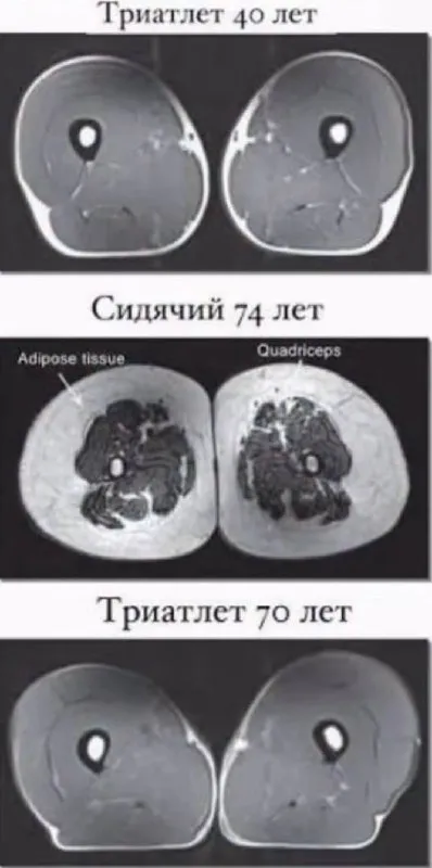 Есть изображения, после которых вопросы про необходимость тренировок просто исчезают. На этом изображении три среза бедра. Сверху бедро 40-летнего триатлониста. Почти всё пространство занимает мышц