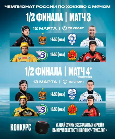 Запускаем ТРАДИЦИОННЫЙ КОНКУРС перед стартом 1/2 финала Суперлиги по хоккею с мячом! Угадай количество забитых мячей в полуфинальных матчах 8 и 9 марта и выиграй Bluetooth-колонку «Триколор». Услови