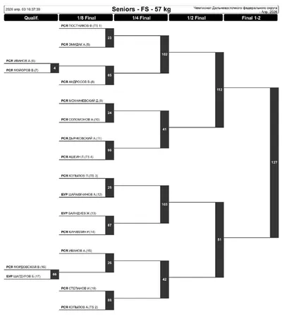 🤼♂️ Сетки чемпионата ДФО по вольной борьбе Программа: 🔺4 апреля ⌚️ 10:00 -18:00 - предварительные и полуфинальные схватки ⌚️ 12:00 - 12:30 - торжественное открытие ⌚️ 18:30 - финалы и награжден
