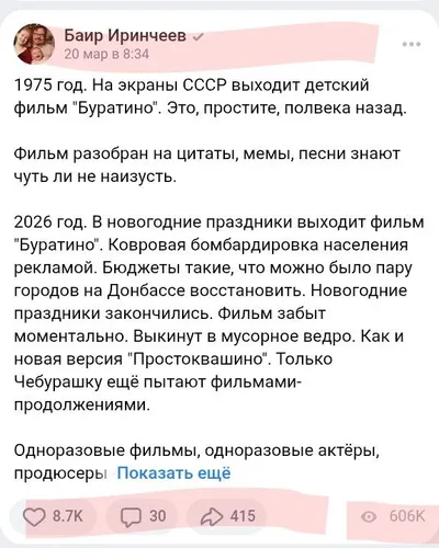 Выложил пост о российском кинематографе. Если ВК не врёт, то по количеству просмотров можно сказать, что В.И.Ленин был прав. Важнейшим из искусств по-прежнему является кино. И его чудовищное состояни