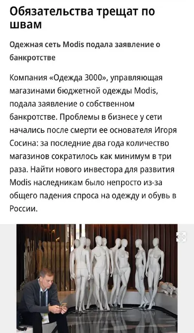 ⚡️ Сеть магазинов одежды Modis подала заявление о банкротстве в Арбитражный суд Москвы. По данным на 2024 год, у компании было около 120 магазинов, но сейчас работает лишь несколько десятков, а её сай