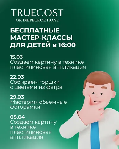 Бесплатные мастер-классы для детей в TRUE COST Октябрьское поле 🌟 Мы подготовили новые увлекательные творческие занятий для наших маленьких гостей. 📅 Расписание мастер-классов: 15 марта 16:00 —