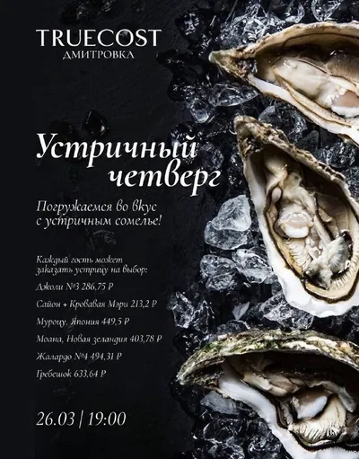 УСТРИЧНЫЙ ЧЕТВЕРГ В TRUE COST НА ДМИТРОВКЕ🦪 26 марта в 19:00 ждём вас на гастрономическом событие — «Устричный четверг». Ставь + в комментариях, если хочешь забронировать стол на мероприятие Для