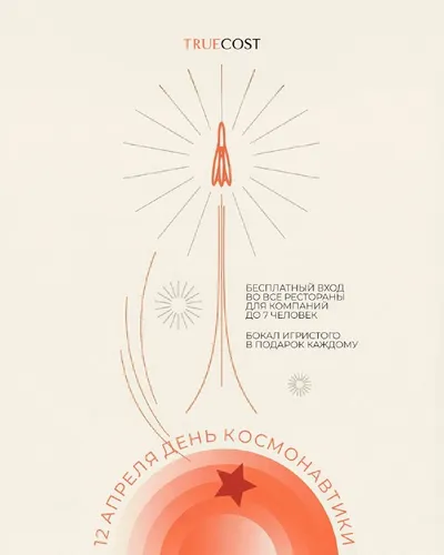 День космонавтики в TRUE COST 🚀 12 апреля — важная дата для всех землян! Ознаменование первого полета человека в космос! В честь праздника дарим 😃 БЕСПЛАТНЫЙ ВХОД во все рестораны сети для компан