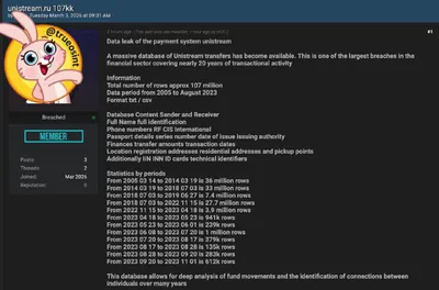 В даркнете выставили на продажу базу данных системы денежных переводов Unistream. Хакеры утверждают, что база международная и содержит сведения за почти 20 лет - с 2005 по 2023 год. Общий объем - бо