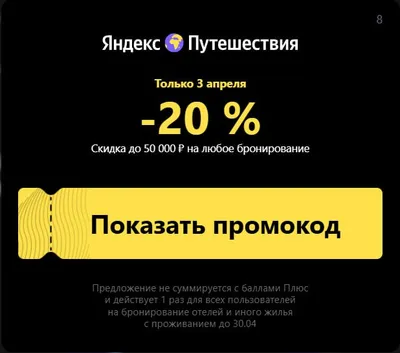 💫 Скидка 20% на отели от Яндекс Путешествий И снова жирная скидка 20% с лимитом в 50 000 ₽ от Яндекс Путешествий сегодня до конца дня по промокоду TP-APRIL-20 на проживание до конца апреля. Ещё ест