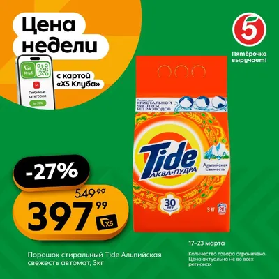 Скидки с югов прилетели! 🦜 Стиральный порошок Tide «Альпийская Свежесть» — 397,99 рублей (-27%). «Пятёрочка» выручает! Все товары по акции на 17–23 марта здесь. 😀 Мы в MAX #акции