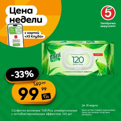 На цветение скидок тут ни у кого нет аллергии? Так и знали. Тогда ловите свежую порцию. 🌿 Влажные салфетки Tolli Plus с антибактериальным эффектом — 99,99 рублей. «Пятёрочка» выручает! Все товары п