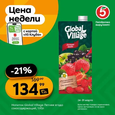 Лунные циклы — это, конечно, хорошо, но мы живём по скидочным. Ловите товары по акции на 24–31 марта. 🍓 Напиток Global Village «Летняя ягода» — 134,99 рублей. «Пятёрочка» выручает! Все скидки на не