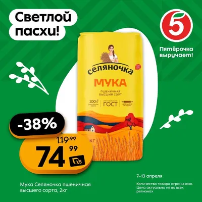 А что, может, испечём пасхальный кулич, где будет только верхушка? ✨ Пшеничная мука «Селяночка» — 74,99 рублей (-38%). «Пятёрочка» выручает! Все скидки на 7–13 апреля здесь. 😀 Мы в MAX #акции