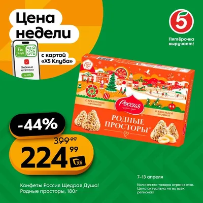 Россия — щедрая душа! И мы тоже. Ловите скидки. 🍬 Конфеты «Россия — Щедрая душа» — 224,99 рублей (-44%). «Пятёрочка» выручает! Полный список товаров по акции на 7–13 апреля по ссылке. 😀 Мы в MAX