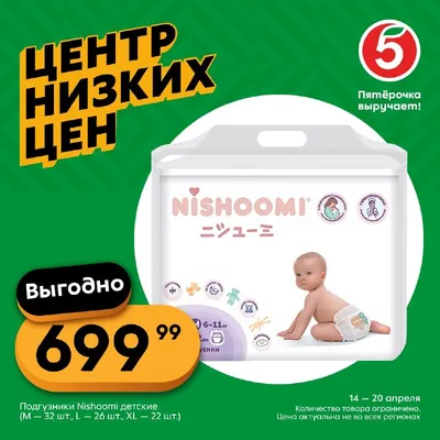 «Центр Низких Цен» возвращается! Естественно, не с пустыми руками. ☁️ Подгузники Nishoomi (M — 32 шт., L — 26 шт., XL — 22 шт.) — 699,99 рублей. «Пятёрочка» выручает! Ищите ценники «Выгодно»! 😀 Мы
