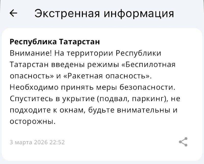 ❗️ В Татарстане объявлены режимы «Ракетная опасность» и «Беспилотная опасность» Необходимо принять меры безопасности. Спуститесь в укрытие (подвал, паркинг) и не подходите к окнам, сообщает МЧС ⚡️Пе