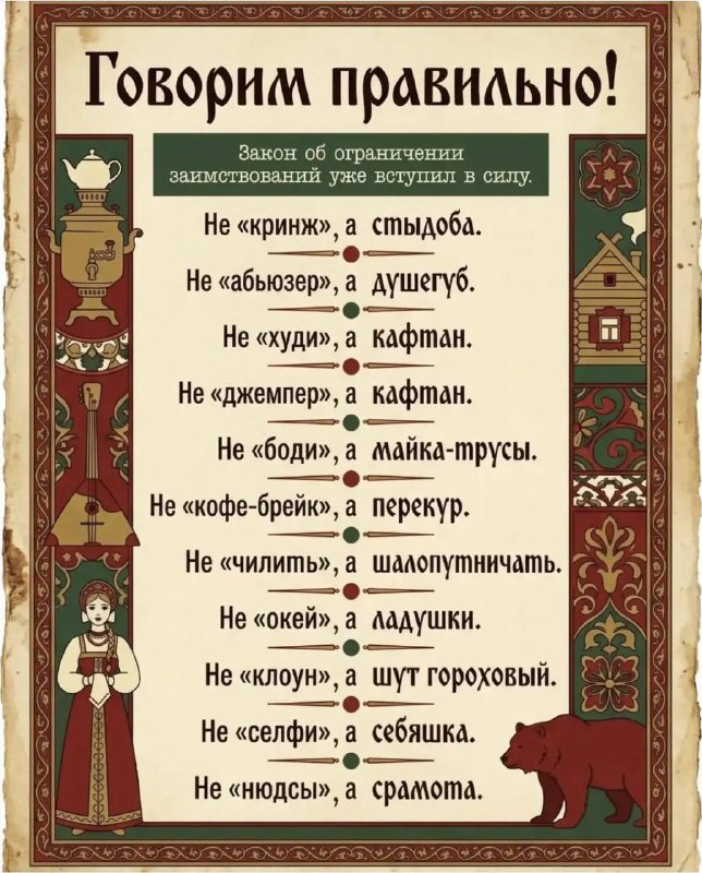 Конечно, самая животрепещущая тема начала недели — новый Закон «О защите русского языка». Уже несколько дней вместо привычных обсуждений вкусов и подачи мы дружно вспоминаем старославянский, перенас