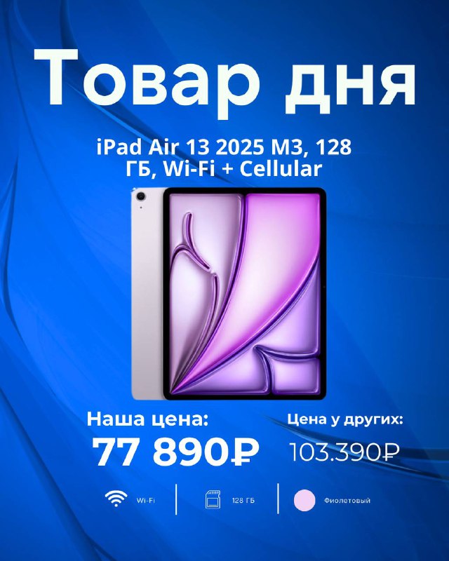 ТОВАР ДНЯ 🔥 💻 iPad Air 13 2025 M3, 128 ГБ, Wi-Fi + Cellular, Фиолетовый — 77.890₽ Стоимость у других: 103.390₽ • iPadOS 18 и Apple Intelligence: наслаждайтесь передовыми функциями и интеллектуа
