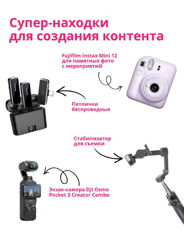 Супер-находки для контента 📸 Создавайте идеальный контент вместе с нами 😍 📱 iPhone 17 Pro 📹 Экшн-камера DJI Osmo Pocket 3 Creator Combo 📸 Фотоаппарат моментальной печати Fujifilm Instax