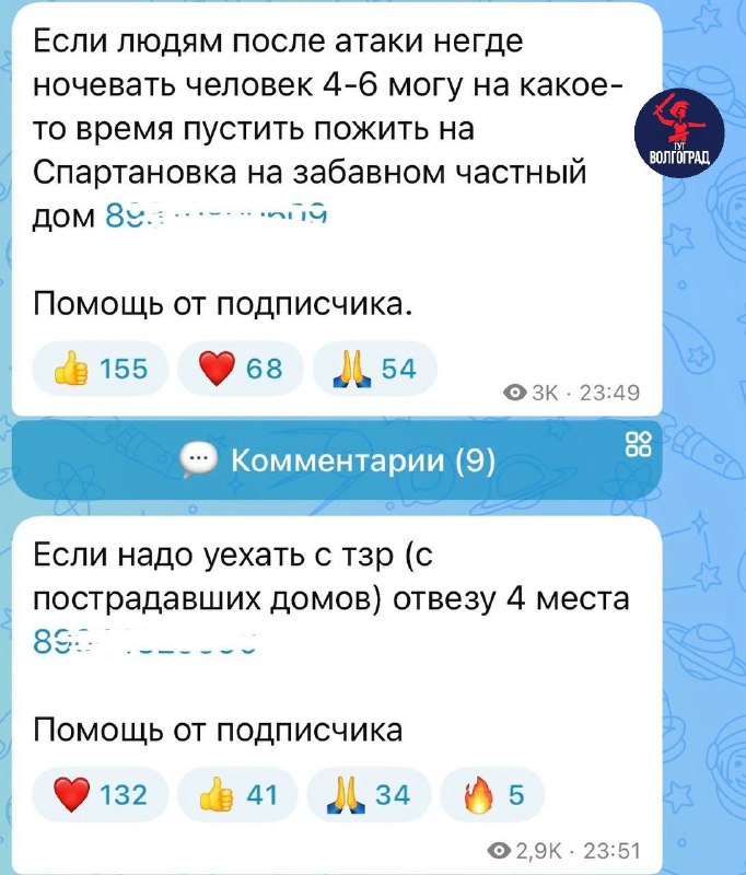 👍 Волгоградцы предлагают помощь пострадавшим в результате атаки БПЛА. В соцсетях жители предлагают продукты, подушки, одеяла. Кто-то готов предоставить места для ночлега. Но призываем жителей сохр