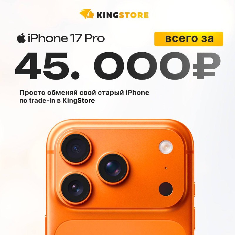 iPhone 17 Pro за 45 000 ₽. Реально🤑 Если использовать трейд-ин и бонусы от KINGSTORE 🎁 Как это считается: − оценим ваше устройства по трейд-ин − скидка по промокоду "МАРТ" к 8 марта – 500 приветс
