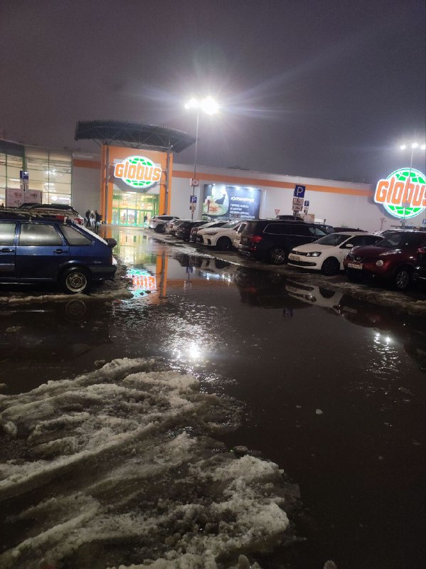 🤷♂️ Парковка «Глобуса» превратилась в море Придётся немного попрыгать через глубокие лужи и изрядно подмочить ботинки, чтобы добраться до гипермаркета от парковки. 📲 Читайте нас в MAX 😊 Подпис