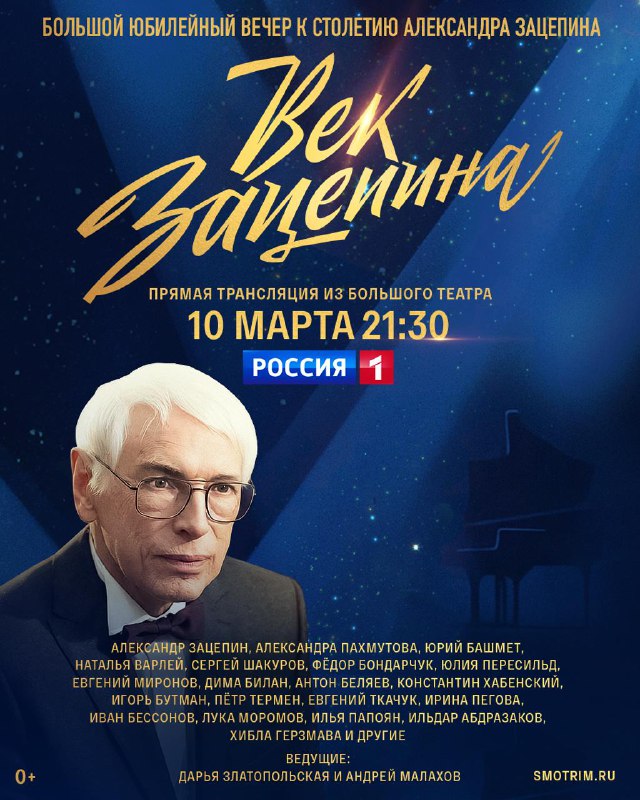 🎶 Музыка, которую знает вся страна! 10 марта отмечаем 100-летие легендарного Александра Зацепина в компании главных звёзд эстрады и кинематографа. 🌟 «Век Зацепина». Большой юбилейный вечер — транс