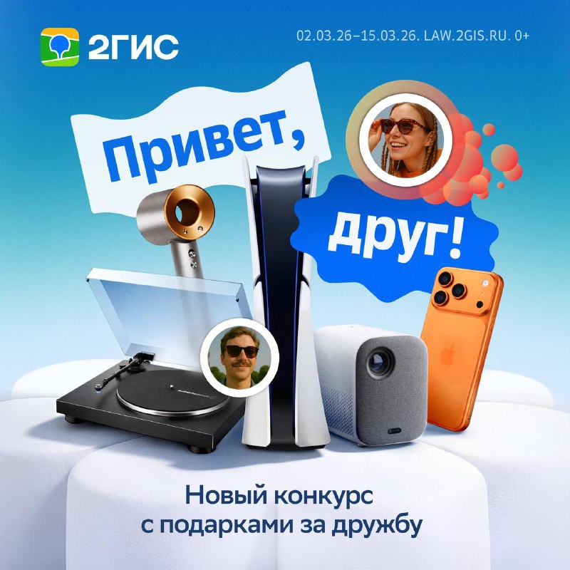 😎 Начинаем весну с конкурса, который точно взбодрит вас с друзьями после долгой зимы. Скажите «Привет, друг!». 💚 Со 2 по 15 марта добавляйте новых друзей в 2ГИС, отправляйте эмодзи, копите баллы и