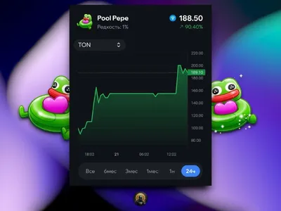 Фламинго Pool Pepe пампят 🎈 За последние сутки флор на Pool Pepe вырос с 50 TON до 188 TON — это рост почти +300%! При этом модель имеет редкость 1%, это примерно 2.000 штук, что не является самой