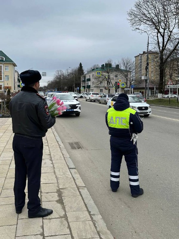В преддверии Международного женского дня сотрудники ГАИ Адыгеи провели традиционную акцию «Цветы для автоледи» 🌷 На дорогах республики полицейские останавливали транспортные средства, за рулем котор