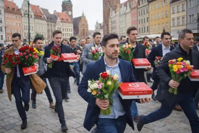 🚨Что происходит во Вроцлаве? С самого утра в центре города заметили десятки мужчин с цветами и подарками. Очевидцы говорят, что такого количества цветов в городе давно не видели. Похоже, сегодня т