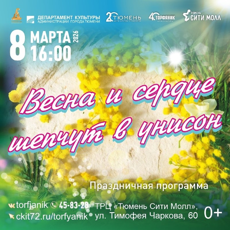 Праздничная программа «Весна и сердце шепчут в унисон» ⏰8 марта (вс), в 16:00 📍ТРЦ «Тюмень Сити Молл», ул. Тимофея Чаркова, 60 💵Вход свободный В программе: 🔹Выступления творческих коллективов ДК