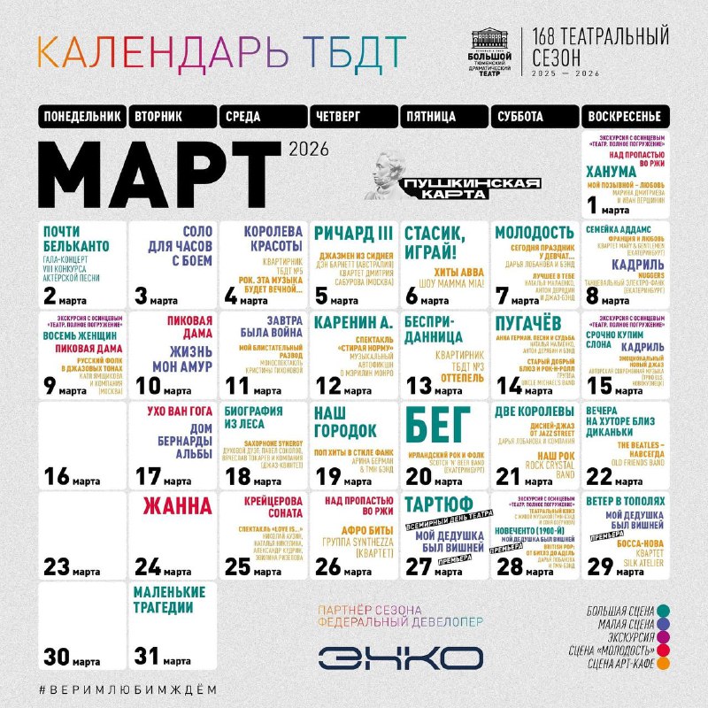 🌸 Публикуем расписание на март ТБДТ Когда: март Где: Тюменский Большой Драматический Театр 🎭 В марте в ТБДТ вас ждёт насыщенная программа спектаклей и концертов. Это отличная возможность провес