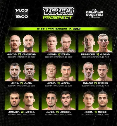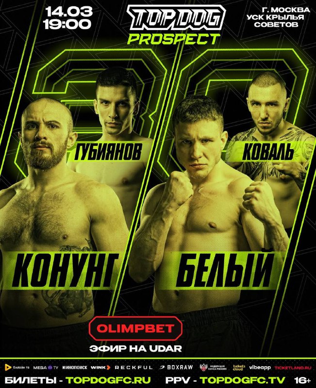 🥊 TOP DOG Prospect 30: Конунг vs Губиянов. 14 марта! Начало прямого эфира в 19:00 по Москве! 📺Где смотреть ❓⬇️ Видеосервис WINK Кинопоиск Билайн ТВ НТВ-ПЛЮС 🇺🇿 Телеканал UDAR в Узбекистан