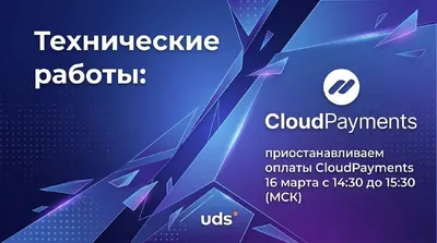 ТЕХРАБОТЫ UDS ✦ CLOUDPAYMENTS ❗️Важная информация! 16 марта с 14:30 до 15:30 (МСК) проводим техническое обслуживание способа оплаты через CloudPayments. Просим приостановить приём заказов с этим мет