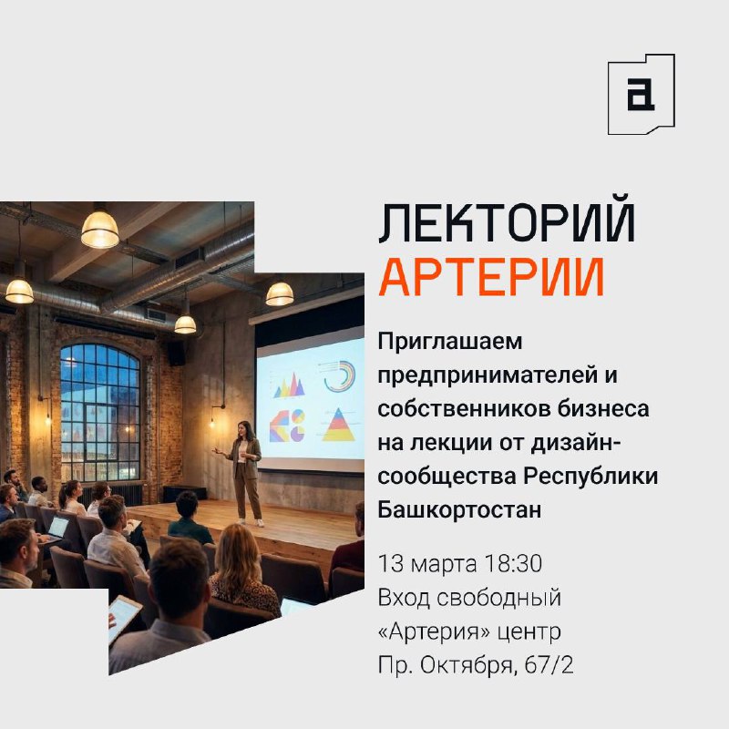 Лекторий Артерии 🗣️ Встреча дизайн сообщества Приглашаем предпринимателей и собственников бизнеса на лекции от дизайн-сообщества Республики Башкортостан. В программе: — Тренды визуальных коммуника