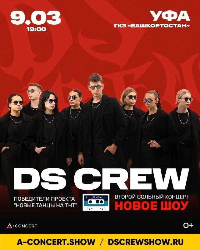 Сольный концерт DS CREW ⏰9 марта (пн) в 19:00 📍ГКЗ «Башкортостан», ул. Ленина, 50 💵Билеты: от 1700р. 🎫Билеты по ссылке - https://a-concert.show/city/ufa/ Победители «Новых Танцев на ТНТ» – групп