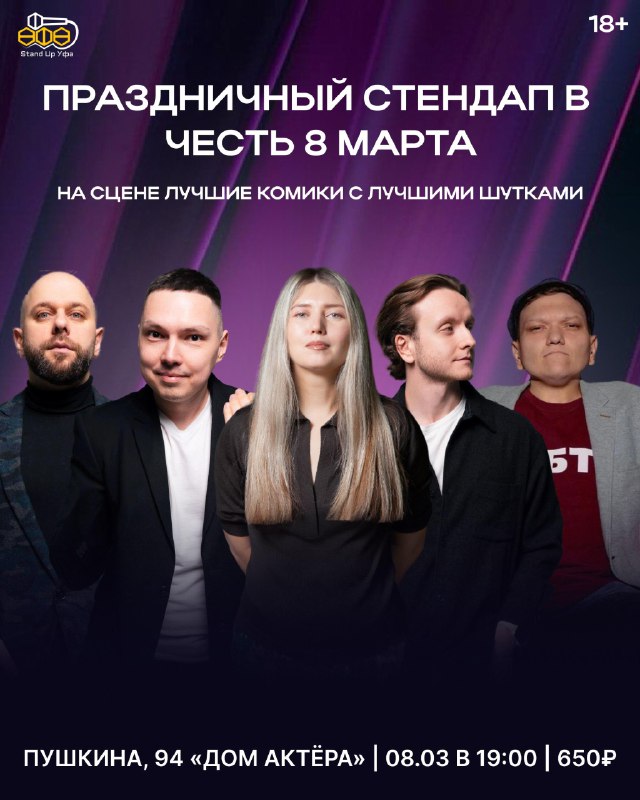 Праздничный стендап-концерт в честь 8 марта ⏰8 марта (вс) в 19:00 📍 Дом актера им. Юсуповой, ул. Пушкина, 94 💵Билеты: 650р. 🎫Билеты по ссылке - https://gostandup.ru/ufa/events/prazdnichnyy_stenda