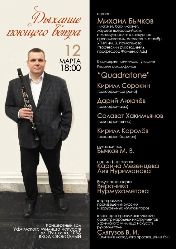 Концерт «Дыхание поющего ветра» ⏰12 марта (чт), в 18:00 📍Уфимское училище искусств (колледж), ул. Пушкина, 103А 💵Вход свободный Играет: Михаил Бычков. В концерте принимают участие Квартет саксофо