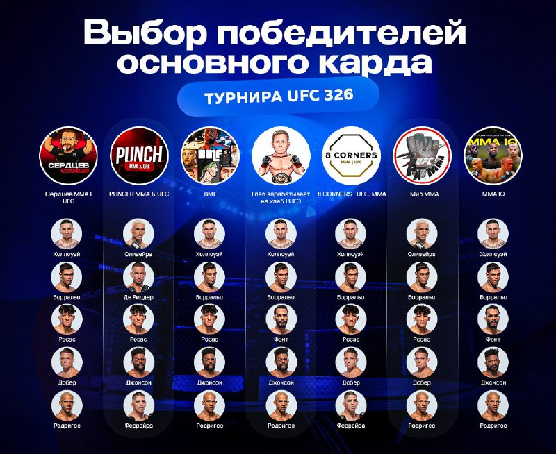Прогнозы на главный кард турнира UFC 326 от авторов каналов по единоборствам. В выборе победителей участвовали: 1. Сердцев ММА | UFC 2. PUNCH I MMA & UFC 3. BMF 4. Глеб зарабатывает на хлеб I UFC 5