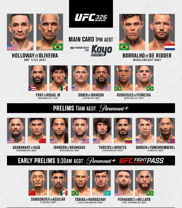 👊 Уже этой ночью UFC 326 ⏰ Начало в 01:00 (мск) 🔝 Главный кард в 04:00 (мск) Регистрируйся на PARI.RU, получай ФРИБЕТ 5х1000₽ и выводи свои выигрыши без задержек. ❕ Почему клиенты выбирают PARI?
