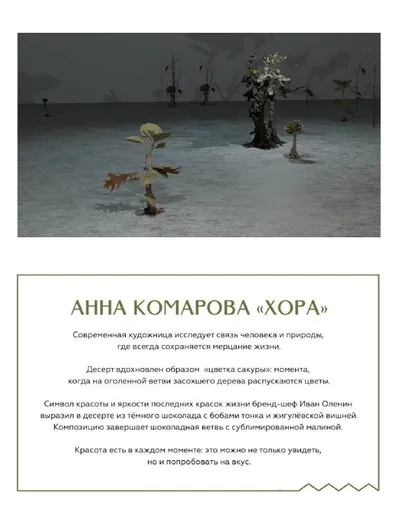 К открытию новой выставки в Галерея «Виктория» команда бистро «Земляне» подготовила специальный десерт «Перерождение». Идея десерта родилась под впечатлением от инсталляции «Хора», созданной художнице