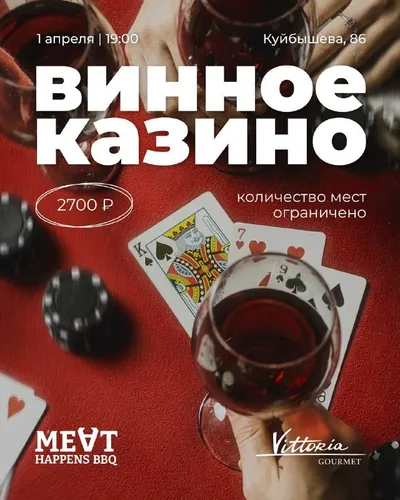 1 апреля в 19:00 пространство Meat Happens BBQ совместно с VITTORIA gourmet открывает двери для особенного вечера, где вместо карт - бокалы, а вместо ставок - вкусы, ароматы и интуиция. Вас ждёт игра