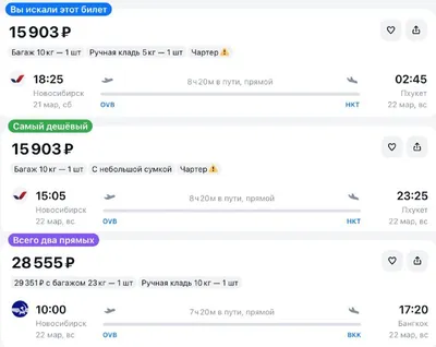 Улететь из Новосибирска в 🇹🇭Таиланд Новосибирск — Пхукет ✈️21 марта 🎟️ 15903₽ ✈️22 марта 🎟️ 15903₽ Новосибирск — Бангкок 🇷🇺22 марта 🎟️ 28555₽ *цена актуальна на момент публикации ❄️ У